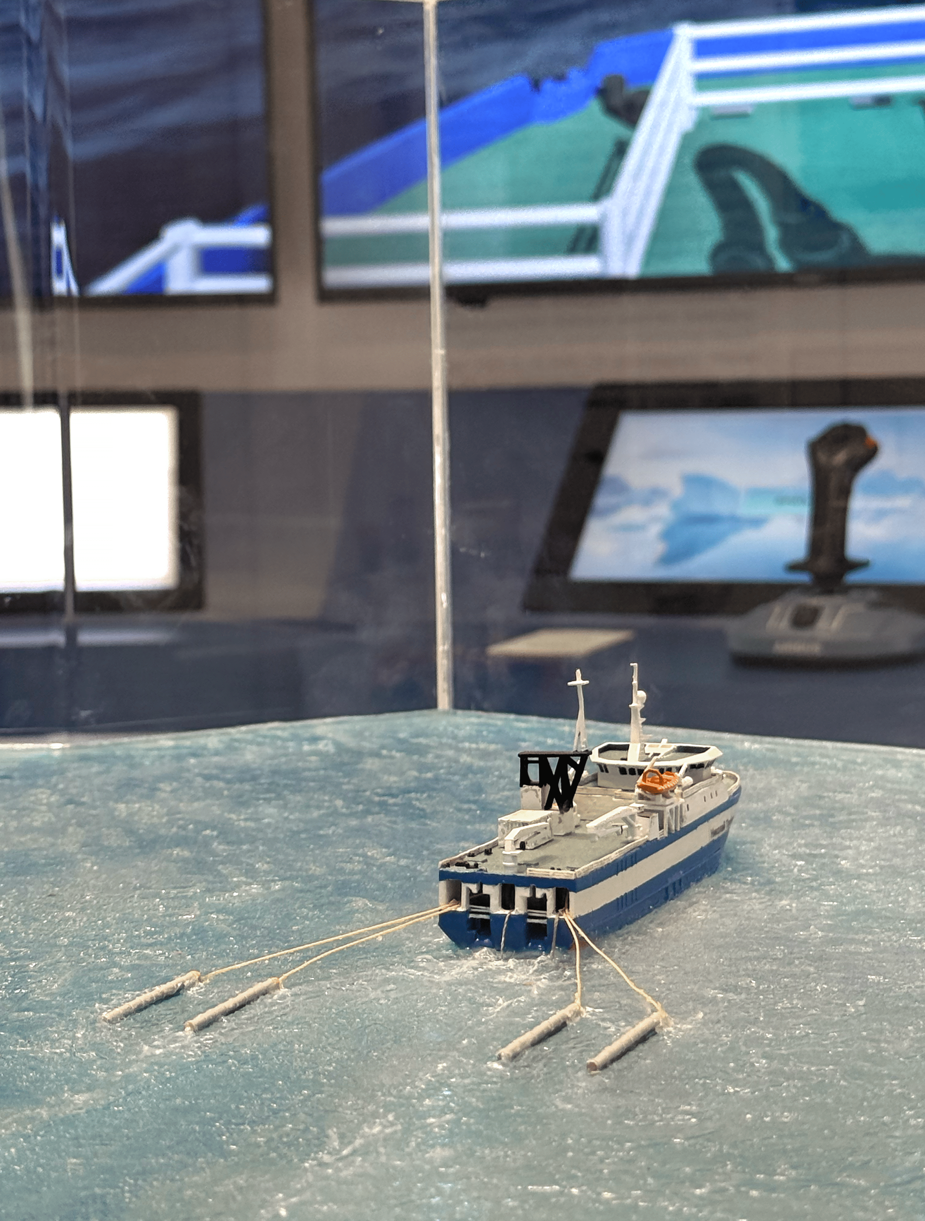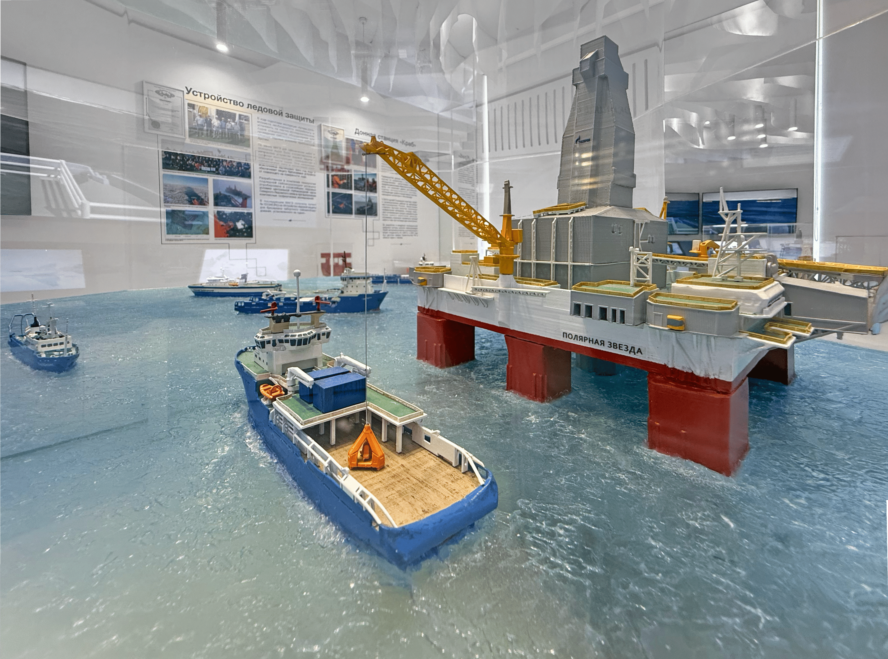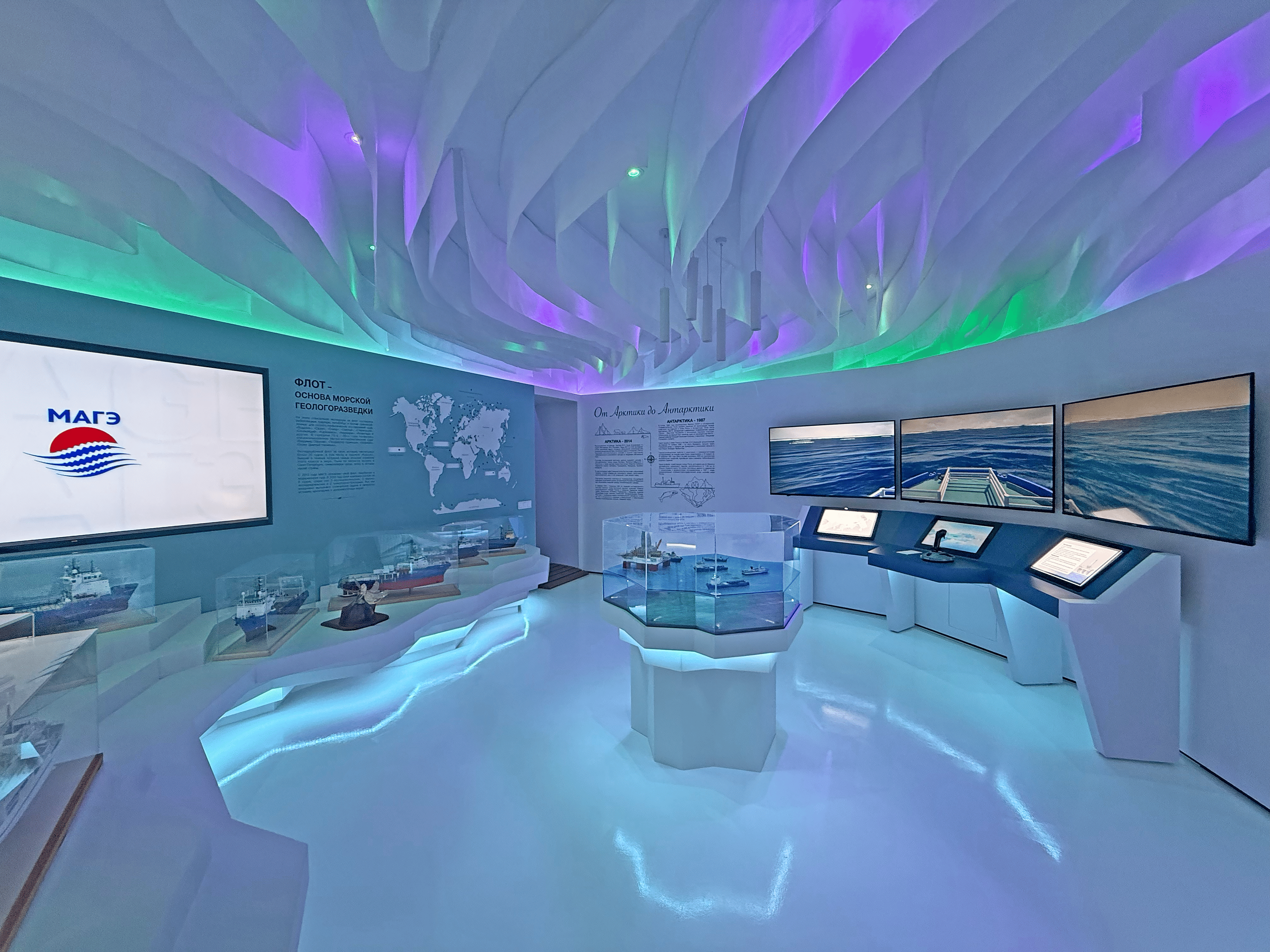 Также в зале оборудован интерактивный контент, где можно попробовать свои навыки судоводителя при осуществлении морской производственной операции.